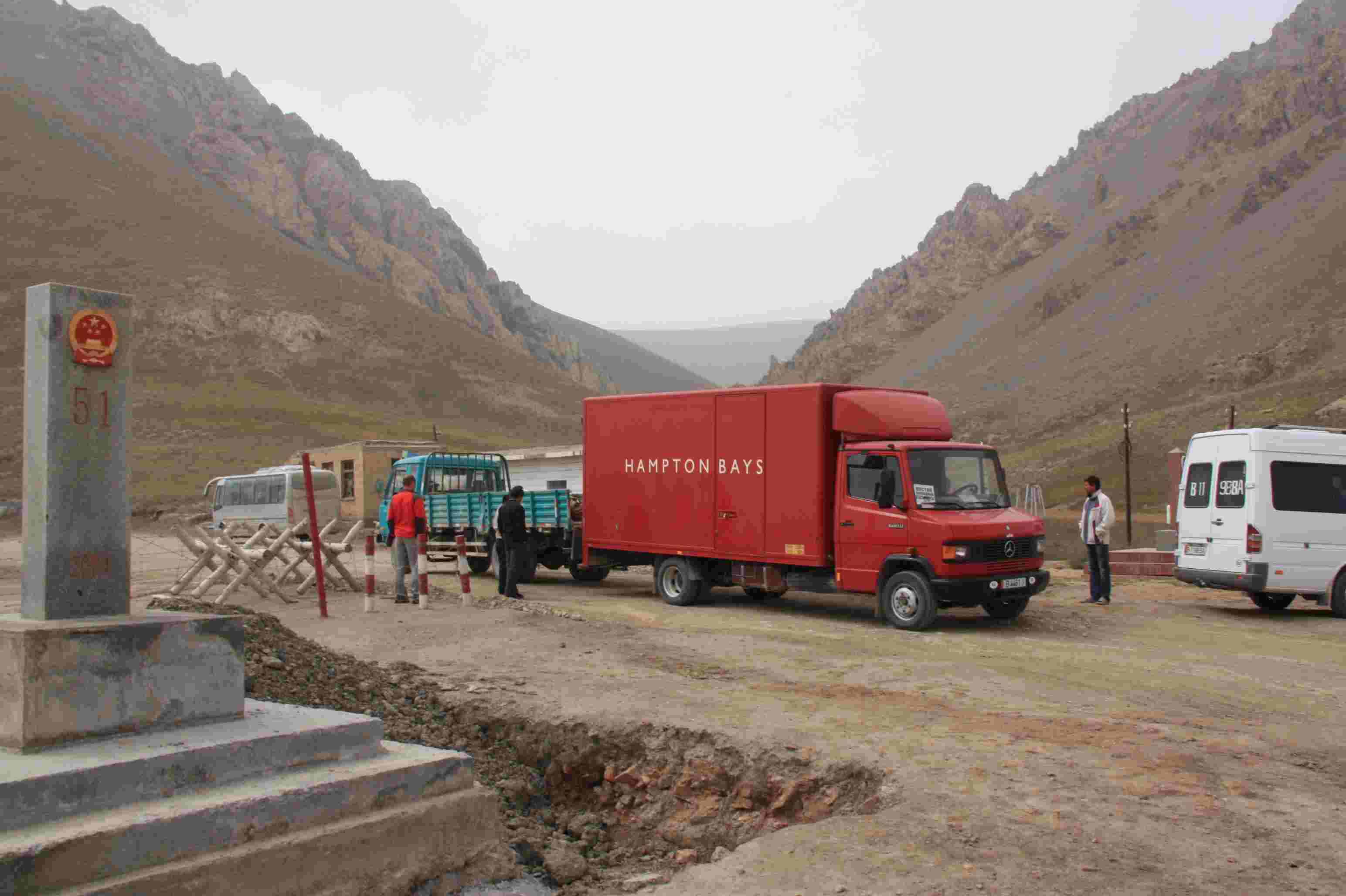 Nous reprenons la route vers le Kirghizstan. Le passage de la frontière se passe sans trop de problèmes.Nous devons décharger tous nos baggages et tout le frêt, pour passer le tout au scanner!