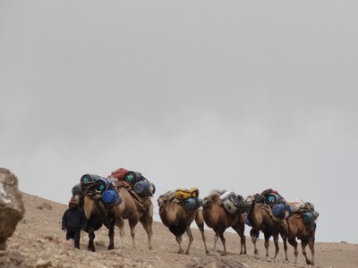 Petit détail auquel nous n'avons pas pensé, c'est que nos chameiliers sont Kirgiz, émigés du Kirgistan et qu'ils ont gardés l'heure de leur pays d'origine, c'est à dire -2 heures par rapport à Andy qui lui est à l'heure chinoise (un seul fuseau horaire pour toute la Chine). C'est donc à 10h que nous nous mettons en route pour monter au col de l'Agil à 4800m (3h) et redescendre au prochain camp (5h). Il est à 4000m (GPS N36°07'41", E 76°36'14").