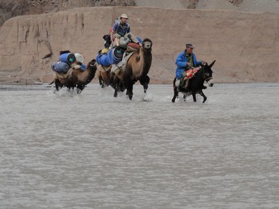 C'est l'avant dernier jour de trek. Nous parcourons cette vallée en la redescendant avec des bras de rivière qui sont de plus en plus larges et qui nous demandent, pour les traverser de "chevaucher" chacuns un chameaux. Partie de rigolade et périlleuse expérience dans un courant d'eau parfois important. Se tenir en équilibre au sommet des charges juchées sur le dos des ces bêtes à 2 mètres du sol nous à tous mis le trouilliomètre à zéro !