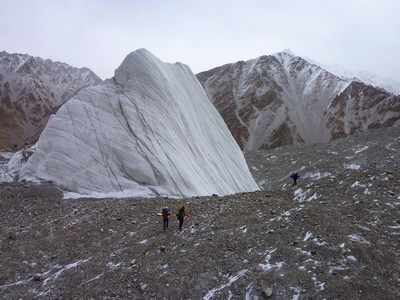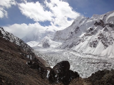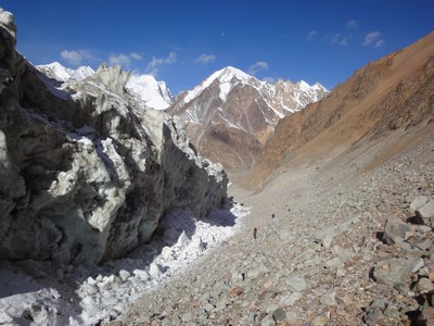 Olivier, Bernard, Mazal et Fred quittent le camp à 7h, il fait nuit et le sentier monte gentiment sur la colline derrière le camp avant d'attaquer une descente vertigineuse dans la vallée qui nous conduit à notre camp 1. La suite du sentier est beaucoup moins drôle car il n'y a plus vraiment de sentier, nous évoluons le long d'un flanc de côteau dans des éboulis instables, ça monte et ça descend, au final c'est très long mais nous ne prenons pas beaucoup d'altitude. Arrivés à Karatash, les muletiers soulagent leurs bêtes et redescendent immédiatement. Malheureusement nous allons devoir traverser le glacier pour aller installer le camp 1 de l'autre côté car nous changeons de vallée. Pendant qu'Olivier et Mazal montent les tentes, Bernard et Fred tentent une traversée du glacier avec un premier portage. 1h30 pour parcourir 1.4km sur un glacier composé d'énormes pénitents, de profonds trous, le tout recouvert par de gigantesques blocs de pierres instables. Ils trouvent un meilleur itinéraire pour le retour. Une petite soupe et tout le monde au lit.