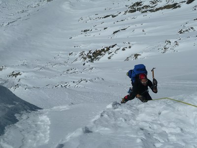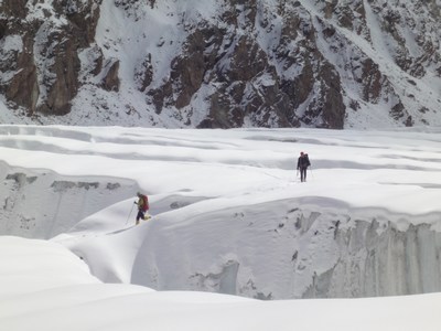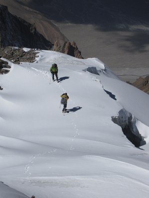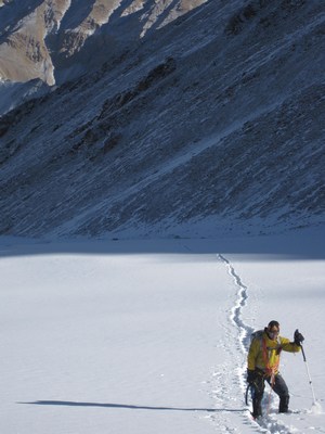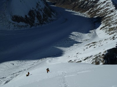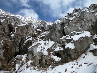 Les dangers liés au glacier sont ainsi éliminés sur une grande partie du trajet, mais le cheminement, à flanc de côteau dans des éboulis instables est très pénible. Au bout d'un moment, nous rejoignons le glacier, ses séracs et ses crevasses, afin de rejoindre le camp provisoire installé par l'autre équipe.