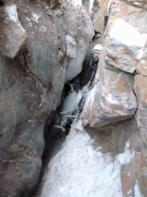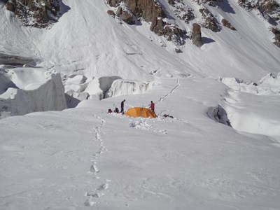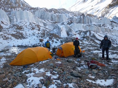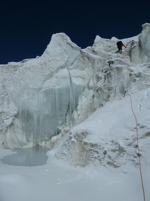 L'équipe du haut tente cette fois-ci de remonter le glacier par sa rive gauche, cela se passe un peu mieux que de l'autre côté mais reste tout de fois très difficile et pénible. Passages sous de gros séracs, montées très raides dans des éboulis puis passages de moins de 50cm de large entre la glace et le rocher sont aux menus du jour. Ils parviennent enfin à trouver un passage pour monter sur le glacier, zigzaguent à travers les séracs avant d'installer un camp provisoire.