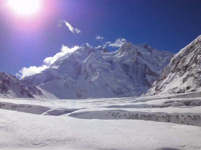 Aujourd'hui nous faisons une tentative pour trouver enfin un itinéraire nous permettant d'avancer dans la face du Beifang. Sebastien, Johan, Nicolas et Martin suivent d'abord les traces de Mazal et Bernhard qui montent sur une arête puis traversent en direction du Beifang. Il y a beaucoup de neige, ce qui rend la progression difficile. Après un problème de départ de plaque à vent dans un couloir, les 4 décident de redescendre sur le glacier et font une dépose de matériel. L'itinéraire testé est déclaré impropre à la consommation. Bilan de la journée: 500 de distance et toujours pas de solution pour attaquer ce Beifang. Martin