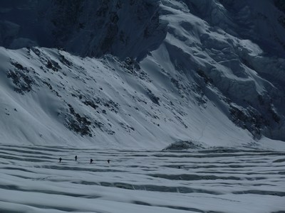 Martin, Mazal, Johan et Bernhard partent installer un camp à 5200m, sur le glacier.