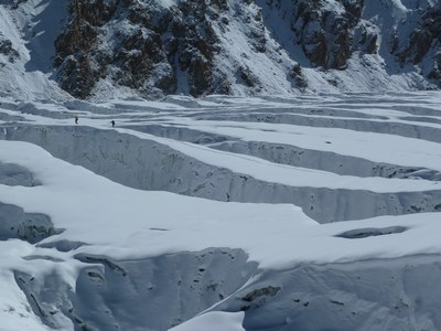 Le 28, nous remontons le glacier qui devient plus plat, mais zébré de crevasses géantes.