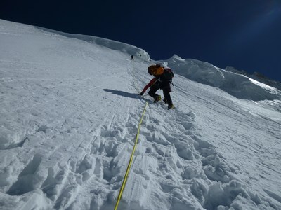 L'équipe du haut plie le camp après une nuit bien fraîche, c'est le premier jour sans nuage et continue son chemin sur le glacier avant d'être obligée de le quitter car il n'y a plus de passage. Ils ont enfin l'impression d'avancer... Cela va durer 500m, avant qu'ils ne se fassent bloquer le passage par un glacier très tourmenté qui descend des flancs de la montagne. Retour sur le glacier et labyrinthe géant sont au menu de cet après-midi. Dépôt matos à 5100m, puis ils commencent la descente au camp 1.